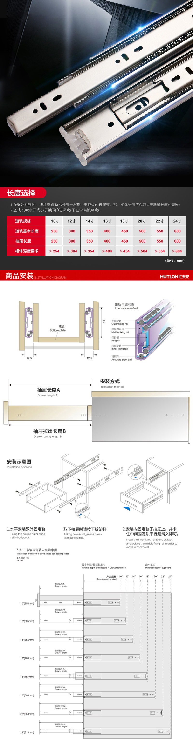 特點:三節結構,4排滾珠聯動,抽拉穩定平順,耐用性好,安裝便捷