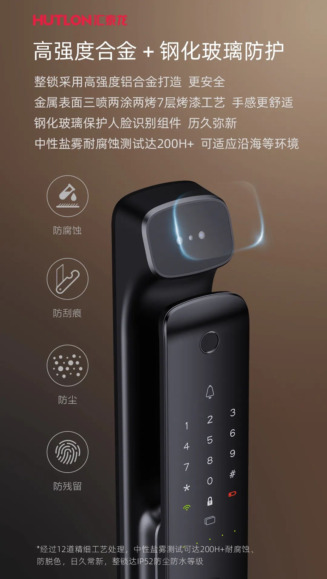 D1f人臉識別智能鎖結合科技創新和生活美學,整鎖采用高強度鋁合金打造,金屬表面三噴兩涂兩烤7層烤漆工藝,鋼化玻璃保護人臉識別組件,中性鹽霧耐腐蝕測試達200H+,整鎖達IP52防塵防水等級 ,可適應沿海等環境。