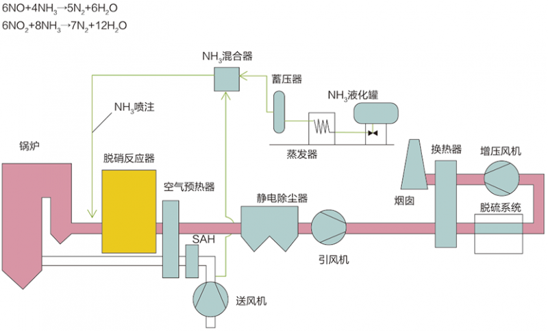 選擇性催化還原法(Selective Catalytic Reduction,簡稱SCR),在一定的反應(yīng)溫度條件下,煙氣中的NOx和還原劑NH3在催化劑作用下發(fā)生還原反應(yīng),生成產(chǎn)物為N2和H2O。