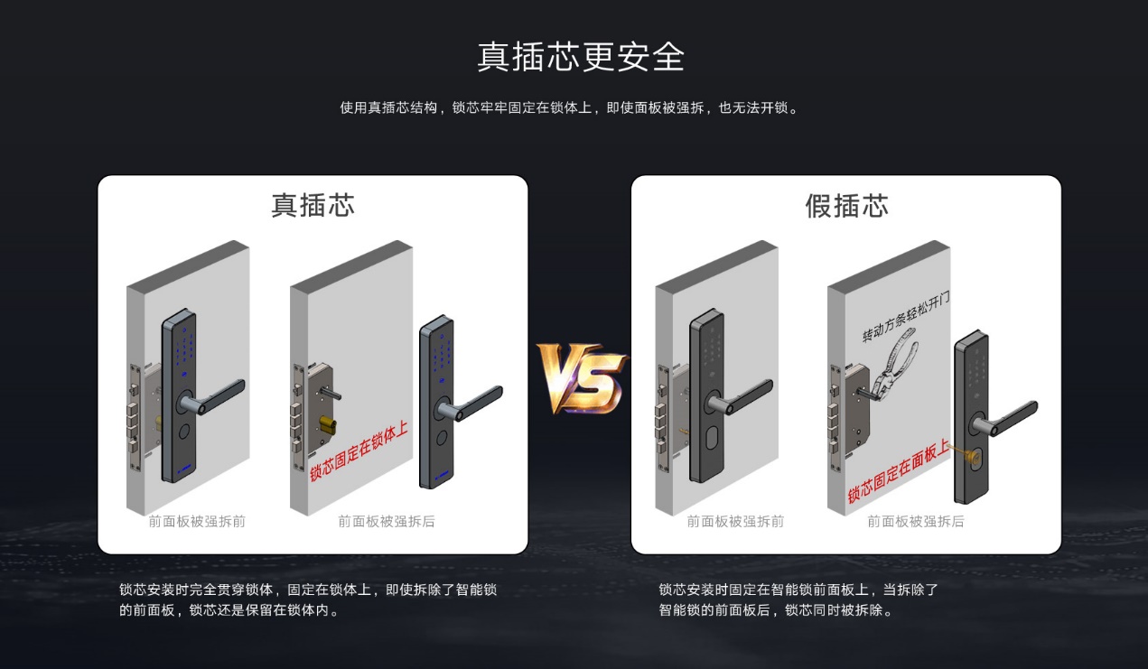 真插芯安裝時完全貫穿鎖體,固定在鎖體上,即使小偷采取暴力手段拆除指紋鎖的前面板,鎖芯還是保留在鎖體內(nèi);C級鎖芯技術(shù)開鎖需要270分鐘以上,暴力開鎖需要30分鐘以上,小偷也只能望門興嘆了。
