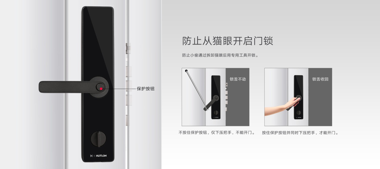 現(xiàn)在有很多小偷會通過拆卸貓眼后用專用工具開鎖。智選智能指紋鎖在室內(nèi)面板把手上設(shè)計了保護按鈕,不按住保護按鈕,僅下壓把手不能開門,按住保護按鈕并同時下壓把手才能開門,防止小偷通過貓眼孔開門。