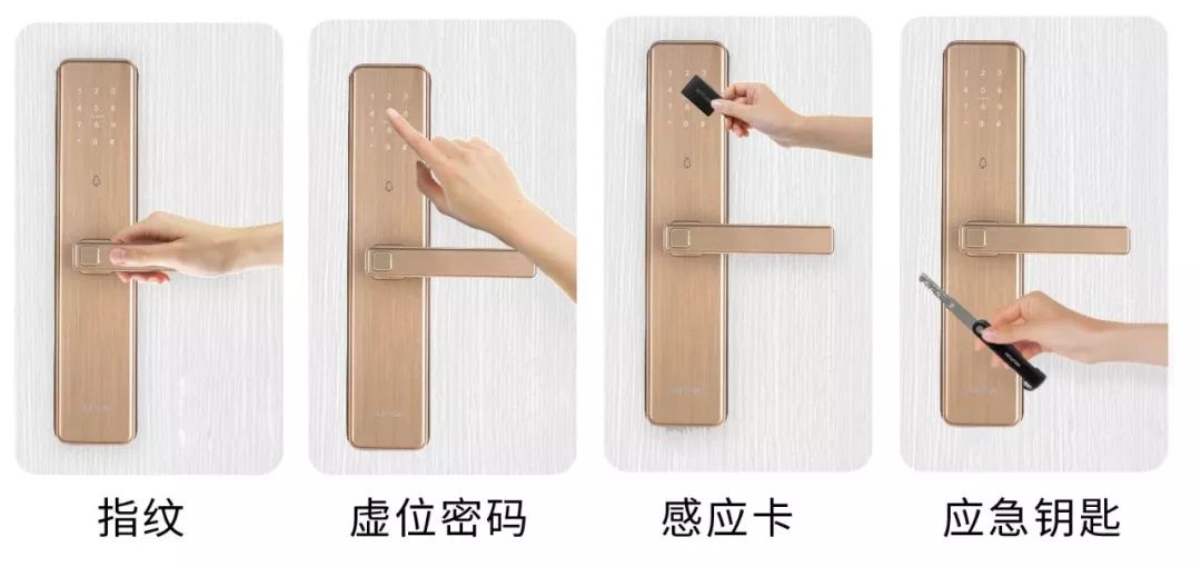 A8s支持指紋、密碼、感應卡及機械鑰匙開鎖方式。“帶光圈半導體FPC指紋頭+指紋把手”設計,開門一氣呵成、一步到位。