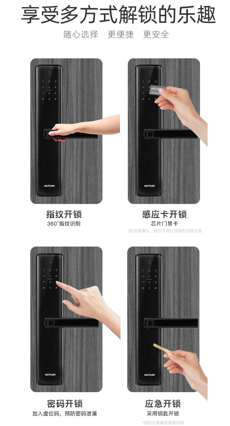 匯泰龍A11智能鎖,支持指紋、密碼、感應(yīng)卡和應(yīng)急鑰匙四種開(kāi)鎖方式。