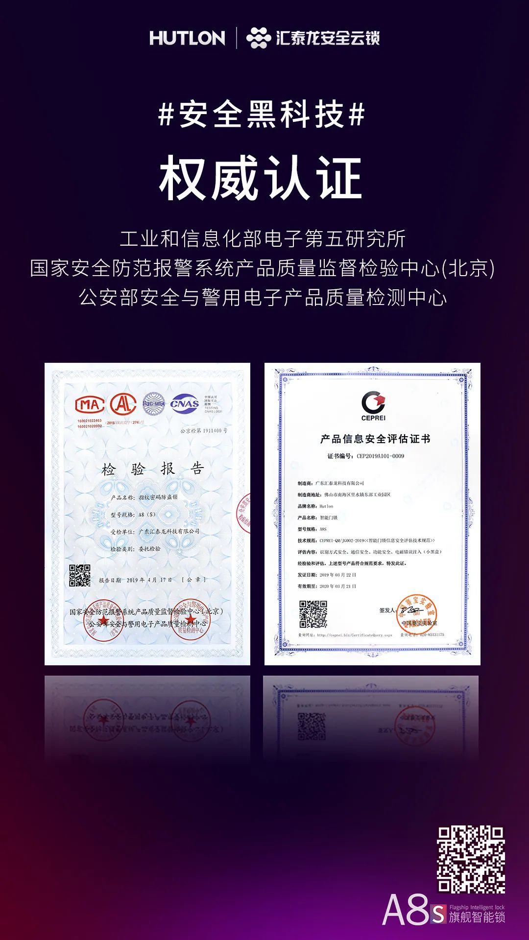 但!這還不夠!匯泰龍A8s智能鎖通過工業(yè)和信息化部電子第五研究所、國家安全防范報(bào)警系統(tǒng)產(chǎn)品質(zhì)量監(jiān)督檢驗(yàn)中心(北京)、公安部安全與警用電子產(chǎn)品質(zhì)量檢測中心的檢驗(yàn),質(zhì)量無可挑剔!
