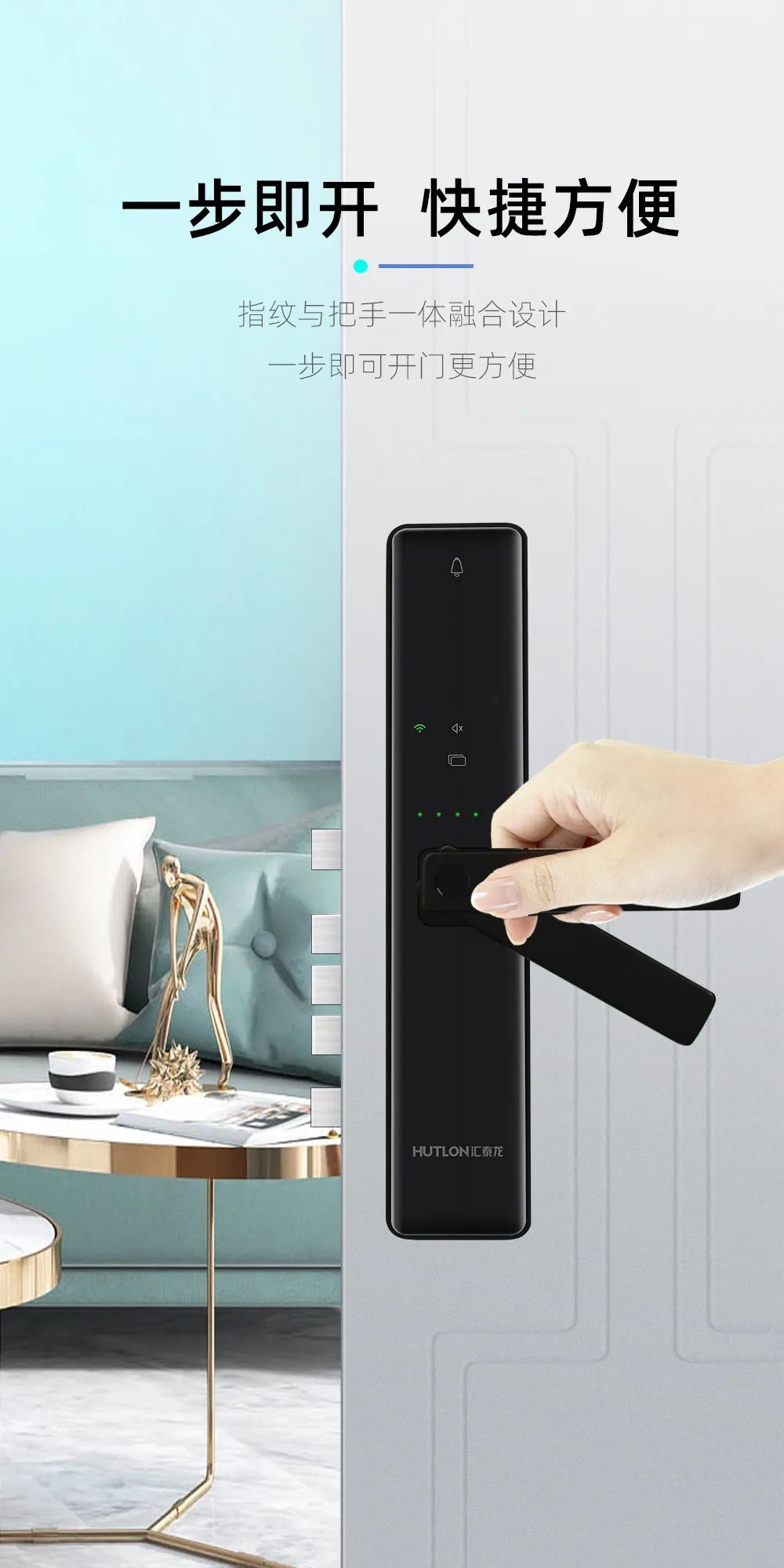 聯(lián)網(wǎng)狀態(tài)顯示、低電量燈光與語音提示、指紋識(shí)別燈效提示,門鎖狀況可視化;