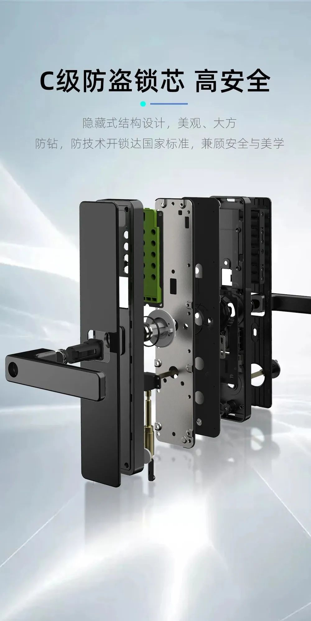 A8 pro旗艦智能鎖采用游離把手設(shè)計(jì),把手回彈后,二次下壓不可開鎖,防止尾隨開鎖。