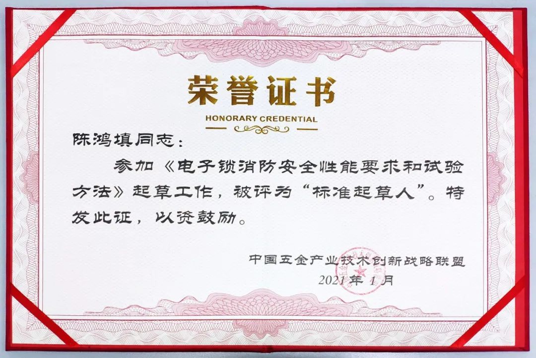 作為《電子鎖消防安全性能要求和試驗方法》的起草單位,匯泰龍榮膺“標準起草單位”榮譽;匯泰龍陳鴻填董事長參與標準的起草,榮膺“標準起草人”榮譽。