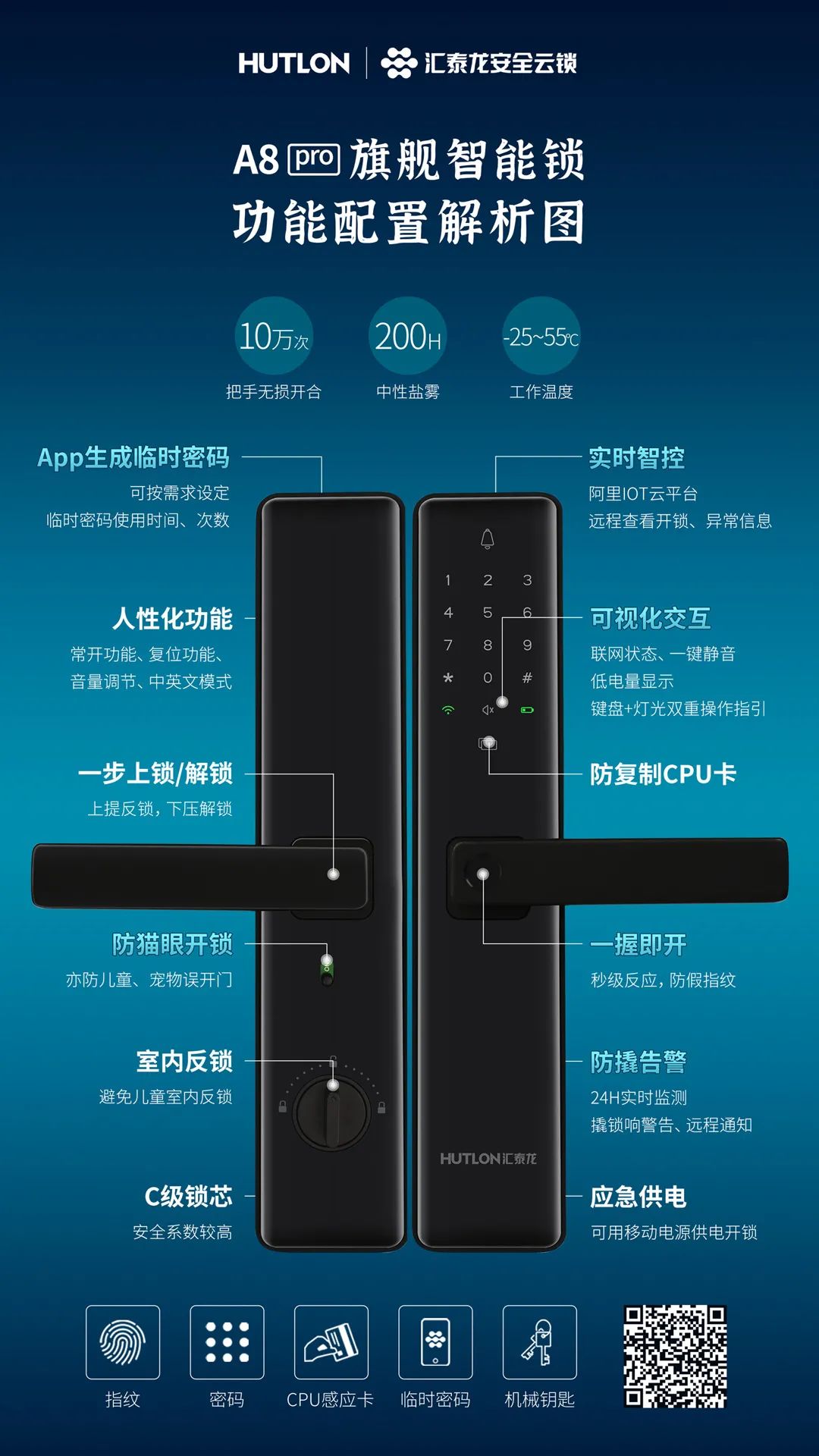 • C級鎖芯+304不銹鋼鎖體+多重傳感器24小時實時監測+防撬告警,匯泰龍A11智能鎖機械硬件與智能防盜兩方面“雙管齊下”,全方位護家,讓家更安全。