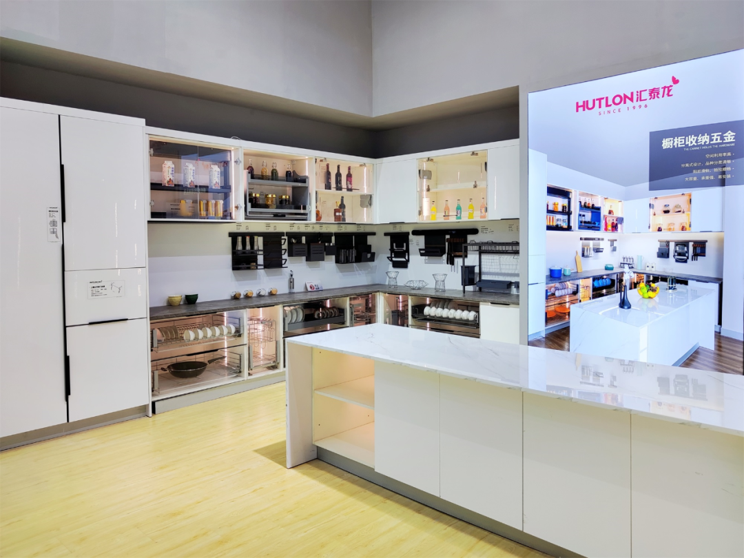 進入展館首先到達匯泰龍定制五金沉浸體驗專區。匯泰龍選取家居生活中,人們最為關注的櫥衣柜收納、智能五金,在展館中1:1搭建還原廚房、衣帽間等家居場景,打造理想家居的樣板,帶來沉浸式觀展體驗。