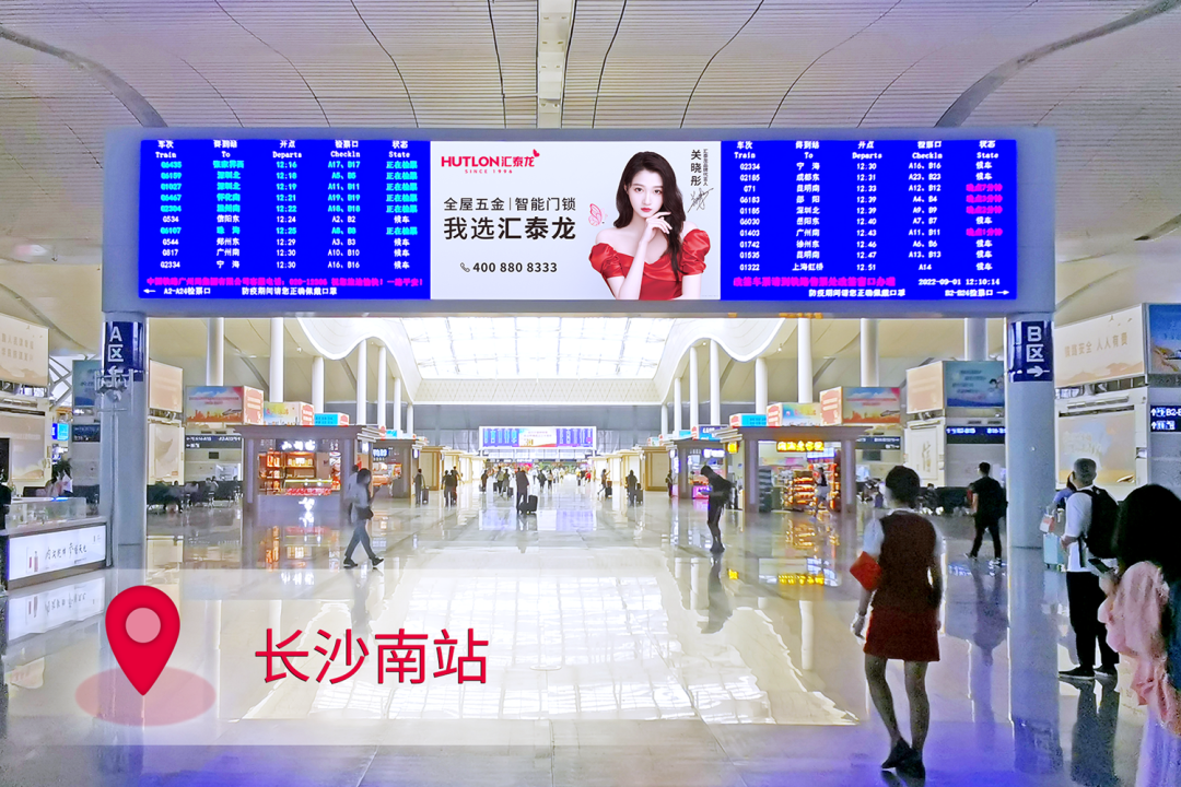 在站臺,作為“第一眼印象媒體”和乘客上下車必看媒體,外車身貼匯聚了站內(nèi)旅客極大的關注度。匯泰龍冠名高鐵列車,整車8節(jié)車廂兩側(cè),均印有匯泰龍logo+“全屋五金丨智能門鎖”,沿途城市皆可展現(xiàn),高效傳達品牌形象,強化記憶。