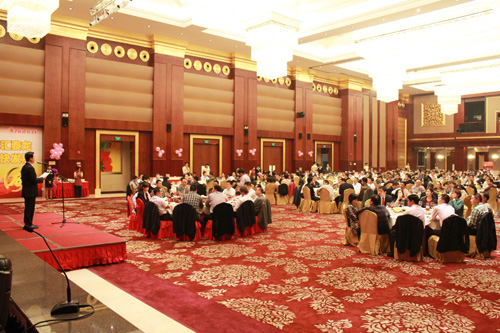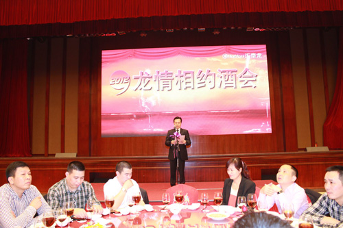 3月20日17:00,在全國經銷商陸續到達廣東佛山三水綠湖酒店后,大家共同合影留下了美好的全家福大合影。隨即,龍情相約酒會開始。酒會現場,公司董事長陳鴻填先生在激昂喜慶的音樂聲中走上主題背景臺,發表了熱情洋溢的祝酒詞。他首先表達了對經銷商遠道而來的熱烈歡迎,接著向大家總體介紹了匯泰龍2011年在行業內取得的突出成績,最后,陳董表達了全體經銷商共同攜手、相互合作、共創佳績的愿望。酒會中,陳董、徐總以及匯泰龍高層管理團隊一同輪流向每一桌遠道而來的經銷商祝酒,整場酒會氣氛溫馨,經銷商們舉杯同慶,在相互的祝愿和經驗交流中,將酒會氣氛一次次推向了高潮。