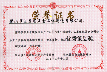 日前,由匯泰龍佛山生產(chǎn)基地所屬地的南海區(qū)里水人民政府安全生產(chǎn)委員會(huì)、里水鎮(zhèn)安全生產(chǎn)創(chuàng)建辦聯(lián)合組織了佛山南海里水安全生產(chǎn)“四不傷害”活動(dòng)中,我公司榮獲“優(yōu)秀策劃”獎(jiǎng)。