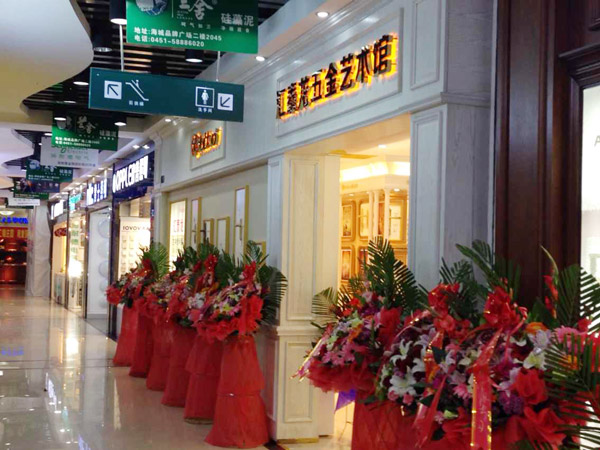 開業當天,花團錦簇,無不彰顯出喜慶的氣氛。走進哈爾濱匯泰龍五金藝術館,整體裝修風格華麗、高雅、古典,形式上以浪漫主義為基礎,在每一處細節中都蘊涵深深的韻味,讓藝術館散發優雅而經典的味道。
