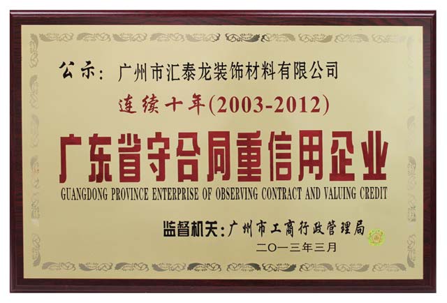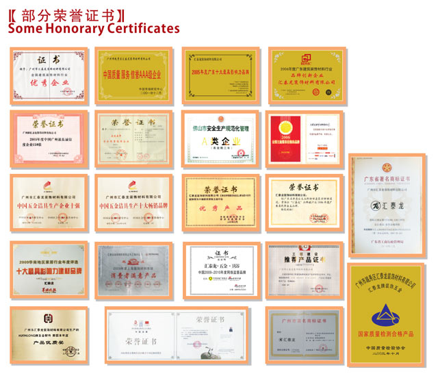 匯泰龍通過ISO9001國際質量體系認證;成立至今,匯泰龍先后榮獲“廣州市著名商標”、“廣東省著名商標”、“中國質量服務信譽AAA級企業”、“廣東省優秀自主品牌”等200多項國家、省市級榮譽和認證。