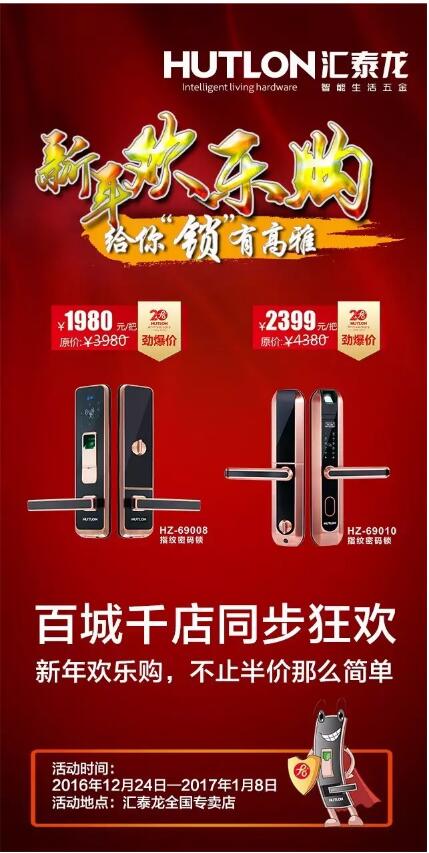 匯聚生活智能量,讓距離不再是問題的匯泰龍云鎖,也將推出圣誕元旦勁爆價!同時還有多款古典、現(xiàn)代門鎖參加本次“新年歡樂購”活動,豈止半價那么簡單!